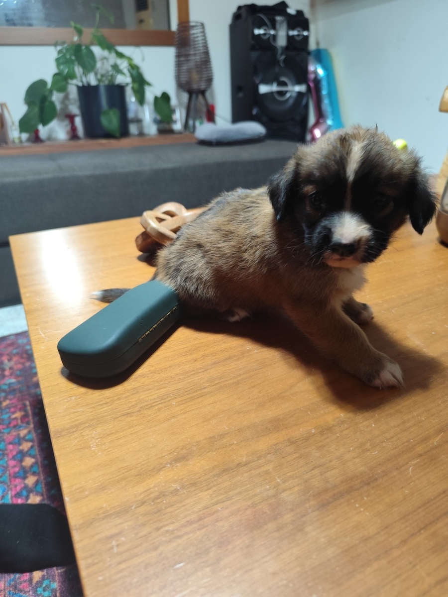 Είναι ημίαιμο θηλυκό. Η μητέρα ειναι ημίαιμο μπόξερ και ο μπαμπάς κοκόνι. Θα γίνει περίπου μεσαίου μεγέθους όταν μεγαλώσει.