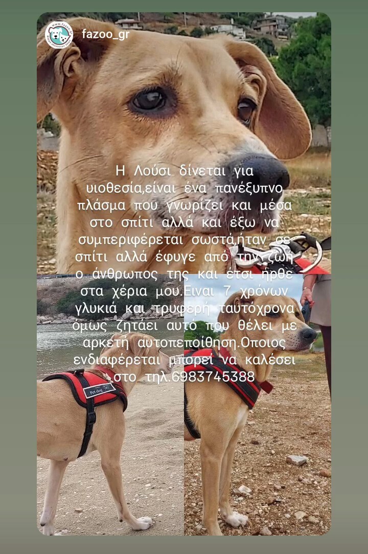 Η Lucy είναι ένα άτυχο ζωάκι γιατί έφυγε από την ζωή ο κηδεμόνας της και έτσι ανέλαβα να της βρω ένα καινούργιο σπίτι,και έχει χάσει την όραση της από το ένα ματάκι της.Ειναι πολύ καλή με ανθρώπους και ζωάκια,με παιδιά καλό είναι υπό την επίβλεψη ενήλικα,είναι 7 Χρονών,είναι πολύ καλή και μέσα στο σπίτι αλλά και στην βόλτα.Ειναι ιδανική συντροφιά χωρίς απαιτήσεις και πολύ εύκολη διαχείριση στην καθημερινότητα!